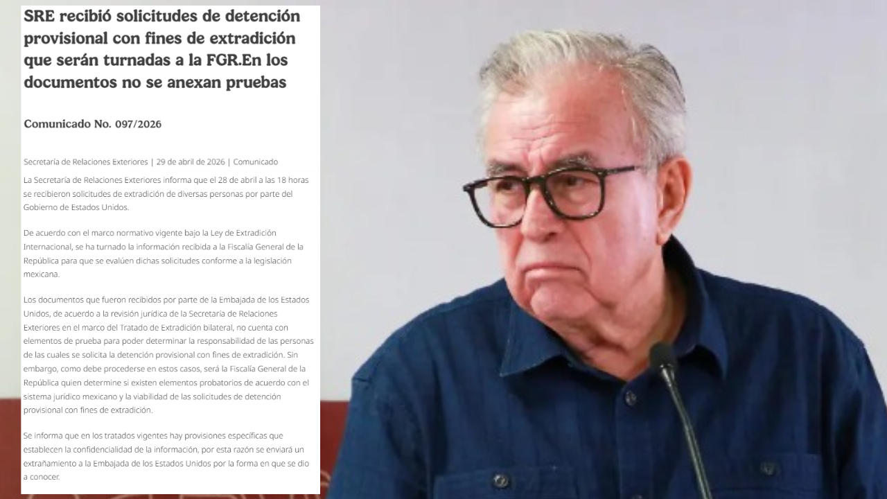 Luego de ser confirmada la acusación de la Fiscalía de Nueva York en contra del gobernador morenista de Sinaloa, Rubén Rocha Moya, la Cancillería mexicana reveló que recibió del Gobierno de Estados Unidos varias solicitudes de extradición de diversas personas, aunque, subrayó, no se anexaron pruebas.