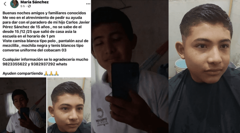 “Buenas noches amigos y familiares conocidos. Me veo en el atrevimiento de pedir su ayuda para dar con el paradero de mi hijo Carlos Javier Pérez Sánchez, de 15 años y de quien no se sabe desde el 15 de diciembre de 2025, cuando salió de la casa hacia la escuela, en el horario de 1 pm. Viste camisa blanca tipo polo, pantalón de mezclilla color azul, mochila negra, tenis blancos tipo Converse y uniforme del Cobacam 03. Cualquier información se lo agradecería mucho 9823355622 y 9382937292 whats. Ayuden compartiendo”.