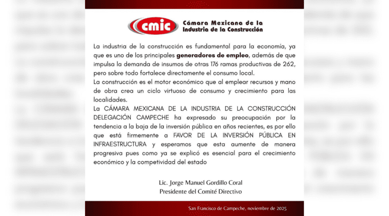 La construcción es el motor económico que al emplear recursos y mano de obra crea un ciclo virtuoso de consumo y crecimiento para las localidades, resaltó, y alertó: “la Cámara Mexicana de la Industria de la Construcción, Delegación Campeche, ha expresado su preocupación por la tendencia a la baja de la inversión pública en años recientes”.