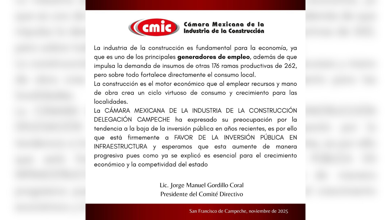 La construcción es el motor económico que al emplear recursos y mano de obra crea un ciclo virtuoso de consumo y crecimiento para las localidades, resaltó, y alertó: “la Cámara Mexicana de la Industria de la Construcción, Delegación Campeche, ha expresado su preocupación por la tendencia a la baja de la inversión pública en años recientes”.