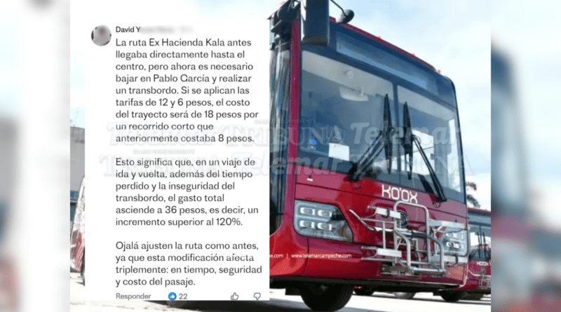 A través de sus redes sociales, el ciudadano David Y. N., se quejó de que por la modificación de la ruta de Exhacienda Kalá ahora debe realizar un transbordo, lo que le significará desembolsar 18 pesos, cuando antes pagaba 8 porque sólo abordaba un camión, pero sumando el retorno le representarán 36, es decir, un incremento superior al 120%, ante lo cual exige que el sistema Ko’ox retorne a la cobertura original.