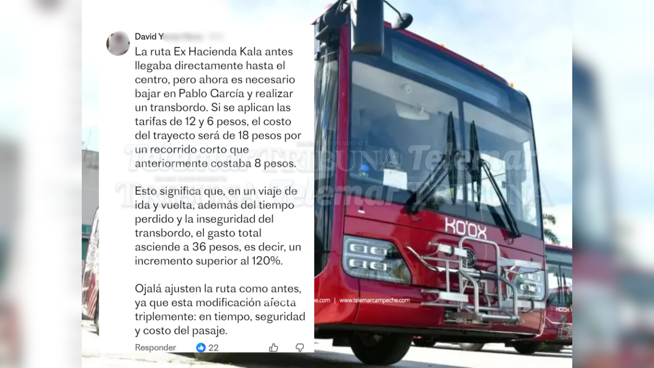 A través de sus redes sociales, el ciudadano David Y. N., se quejó de que por la modificación de la ruta de Exhacienda Kalá ahora debe realizar un transbordo, lo que le significará desembolsar 18 pesos, cuando antes pagaba 8 porque sólo abordaba un camión, pero sumando el retorno le representarán 36, es decir, un incremento superior al 120%, ante lo cual exige que el sistema Ko’ox retorne a la cobertura original.