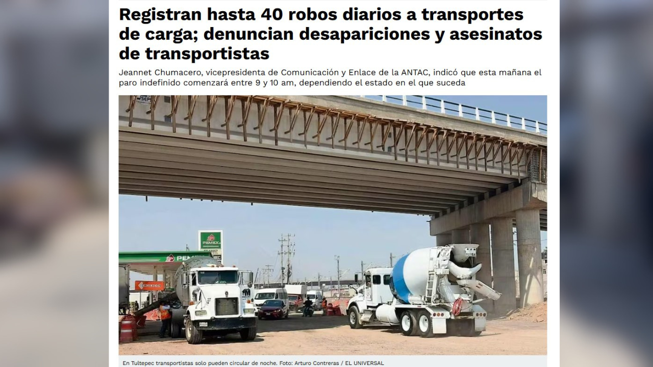 Mientras el Gobierno de Claudia Sheinbaum Pardo asegura que no hay motivos para bloqueos, pues ya atendió demandas del campo y transporte, la Asociación Nacional de Transportistas (Antac) denunció que sus agremiados registran hasta 40 robos diarios, además de desapariciones y asesinatos, y rechazó la postura oficial al aseverar que el Gobierno de México ignora las necesidades y problemáticas reales y diarias que enfrentan los hombres-camión en las carreteras, por lo tanto, no conoce la realidad.