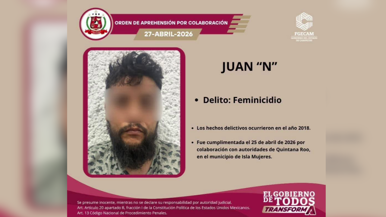 Juan “P” enfrenta cargos por feminicidio, y fue detenido en Isla Mujeres el sábado 25 de abril del presente año, en cumplimiento a la orden de aprehensión.