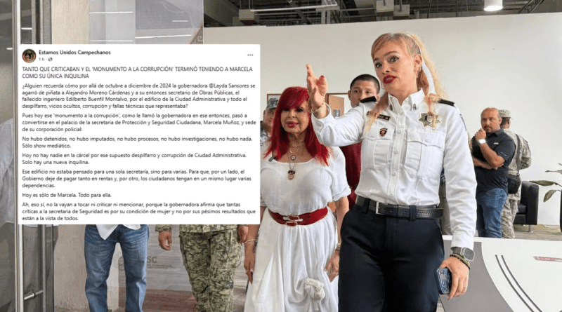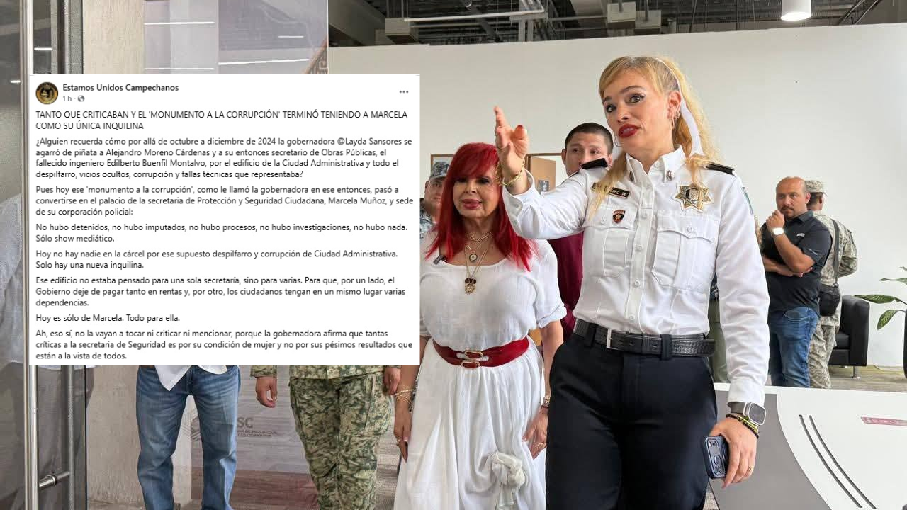 A través de una publicación difundida en sus redes sociales, la página Estamos Unidos Campechanos destaca que entre octubre y diciembre de 2024, Layda Sansores se lanzó con todo contra el exgobernador Alejandro Moreno por el “monumento a la corrupción” que representó el edificio de Ciudad Administrativa, pero hoy ese edificio que debió albergar varias dependencias para evitar pago de rentas fue asignado sólo a la jefa policiaca, la guanajuatense Marcela Muñoz, y no hubo procesos ni investigación, sólo show mediático.