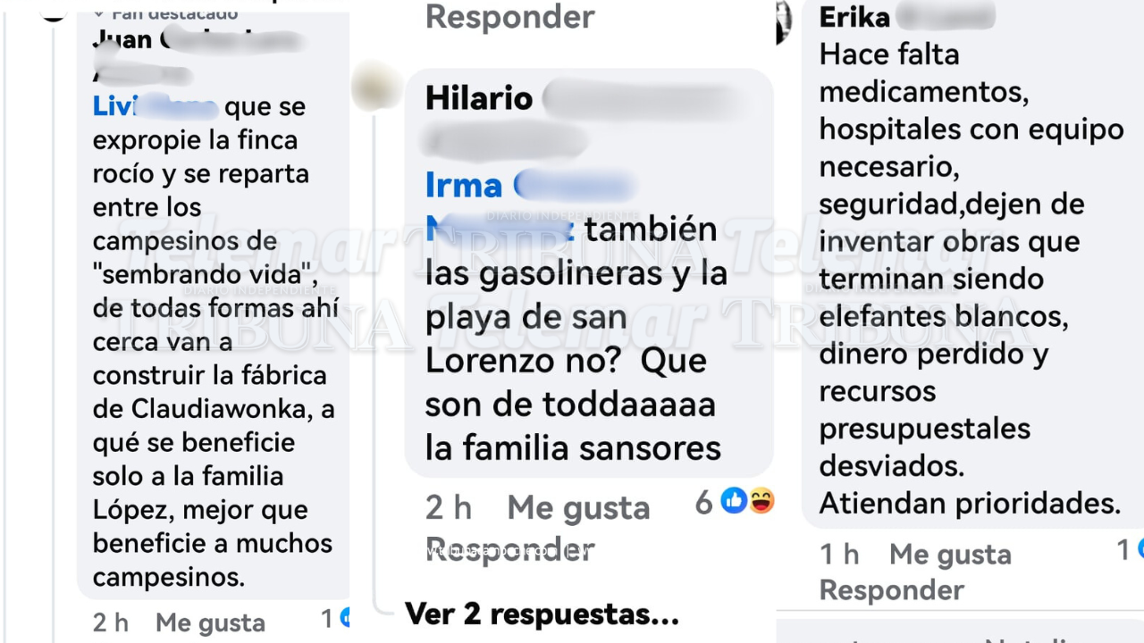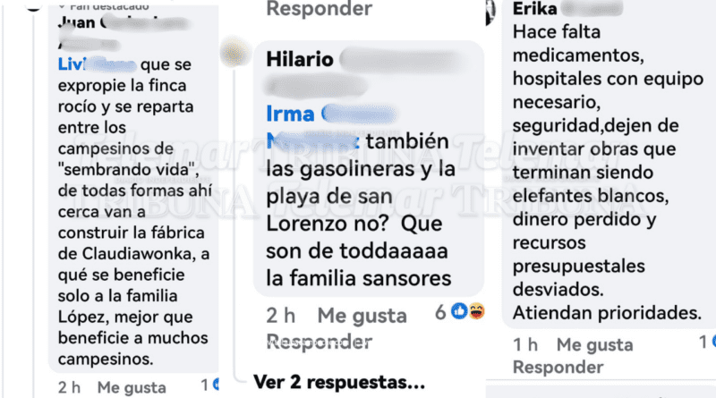 Otro escribió: “Que se expropie la finca ‘Rocío’ y se reparta entre los campesinos de ‘Sembrando vida’, de todas formas ahí cerca van a construir la fábrica de Claudiawonka, a que se beneficie sólo a la familia López, mejor que beneficie a muchos campesinos”.