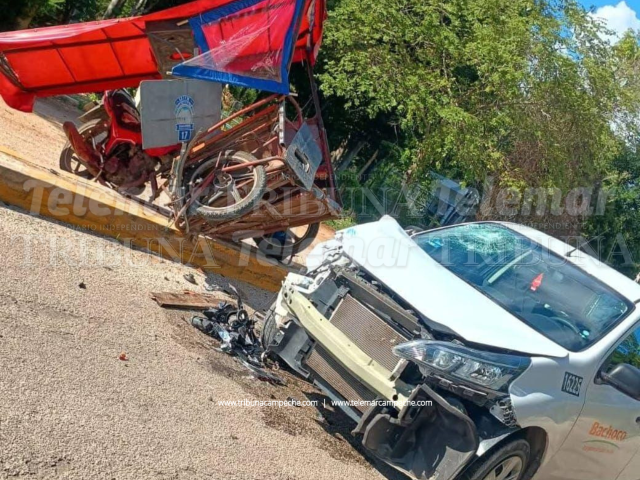Hecelchakán.- En la avenida San Cruz-Hecelchakán, un choque de frente entre un mototaxi y un automóvil de la empresa Bachoco dejó saldo de tres personas lesionadas, entre ellos un menor de edad, quienes tuvieron que ser trasladadas al hospital IMSS-Bienestar.