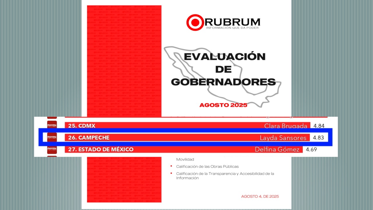 La gobernadora de Campeche, Layda Sansores San Román, se ubicó nuevamente en los últimos lugares de la más reciente evaluación nacional de gobernadores de la encuestadora Rubrum, correspondiente a agosto de 2025. En el rubro de desempeño general, obtuvo una calificación de 4.83, que la colocó en el lugar 26 de 32.