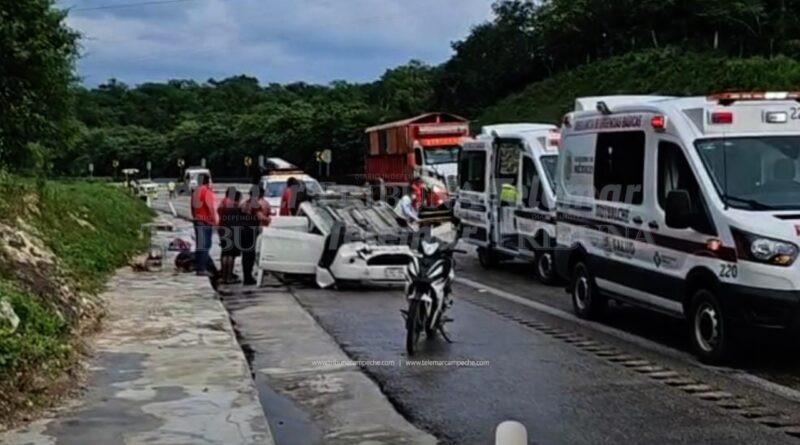 Una persona resultó lesionada luego de que el automóvil en el que viajaba volcó en la conocida curva del Diablo, ubicada en el kilómetro 60 de la carretera Mérida–Campeche, rumbo a la capital del estado. El accidente se habría producido por exceso de velocidad y pavimento mojado, provocando que el vehículo tomara mal la curva y quedara con las llantas hacia arriba.
