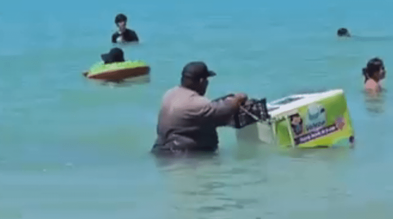 En un hecho que rápidamente se volvió viral en las redes sociales, un vendedor de paletas de hielo fue captado acercando su producto a bañistas pero dentro del mar.