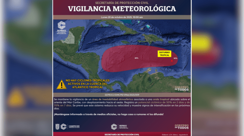 El sistema registra un potencial ciclónico del 50 por ciento en dos días y del 70 por ciento en siete días. Se prevé que en los próximos días reduzca su velocidad de desplazamiento y muestre signos de intensificación conforme avance sobre aguas más cálidas de la región.