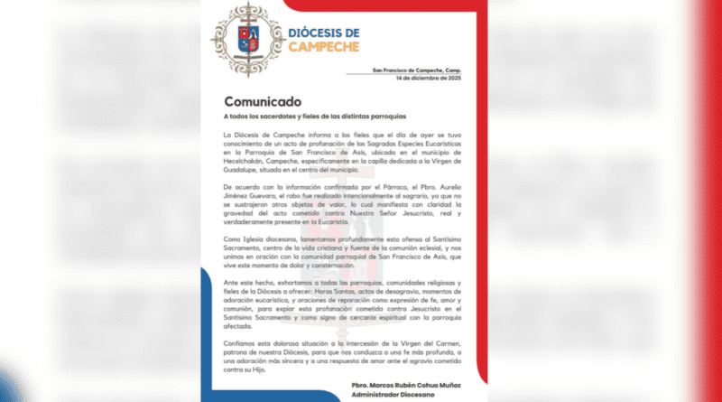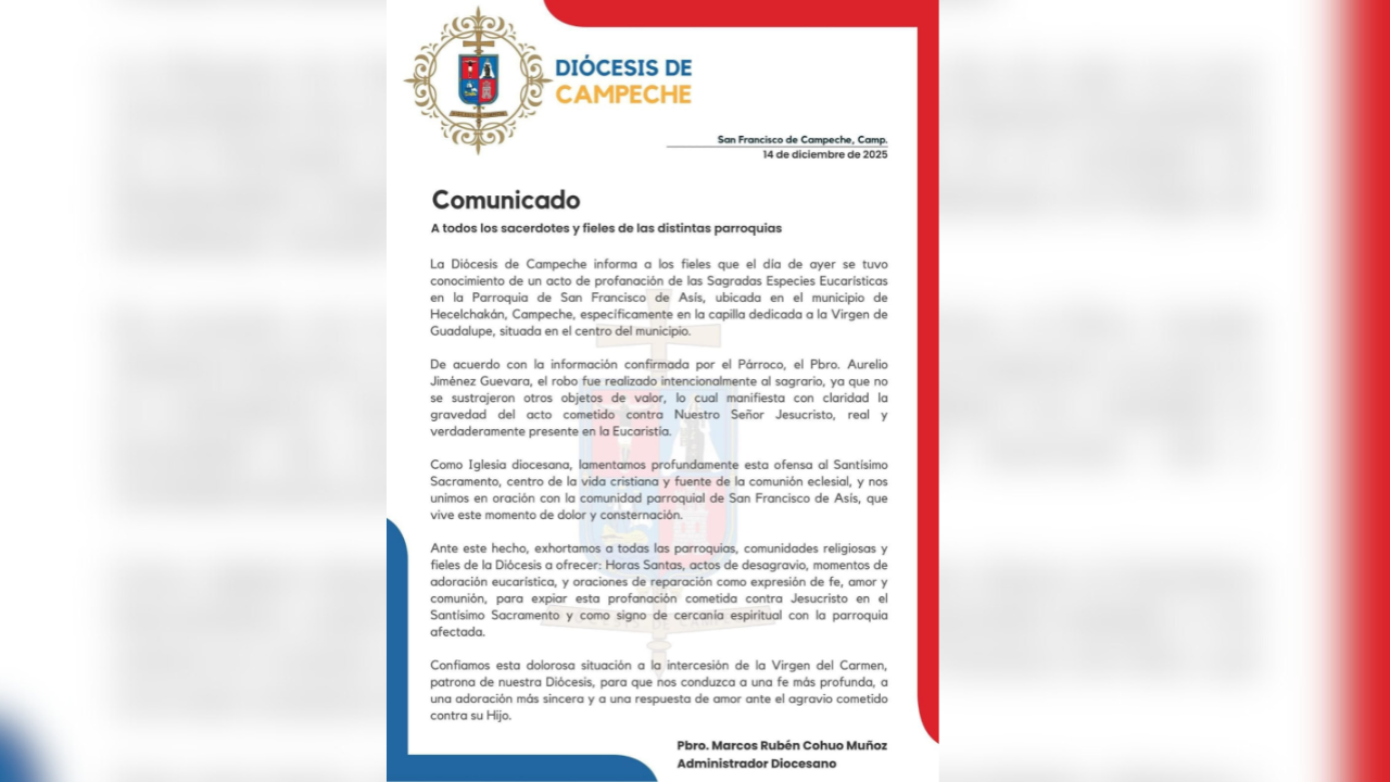 Mientras las autoridades estatales insisten en su discurso del Campeche seguro, la Diócesis de Campeche informó que el sábado se tuvo conocimiento de un acto de profanación de las Sagradas Especies Eucarísticas en la parroquia de San Francisco de Asís, ubicada en el Municipio de Hecelchakán, Campeche. El hecho ocurrió específicamente en el recinto religioso dedicado a la Virgen de Guadalupe, en el centro de la cabecera municipal.