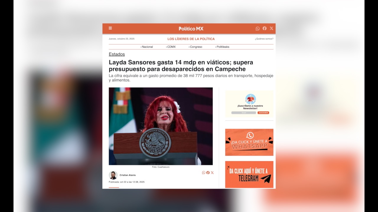 Más información: https://politico.mx/2025/10/22/layda-sansores-gasta-14-mdp-en-viaticos-supera-presupuesto-para-desaparecidos-en-campeche/
